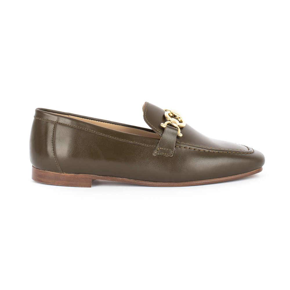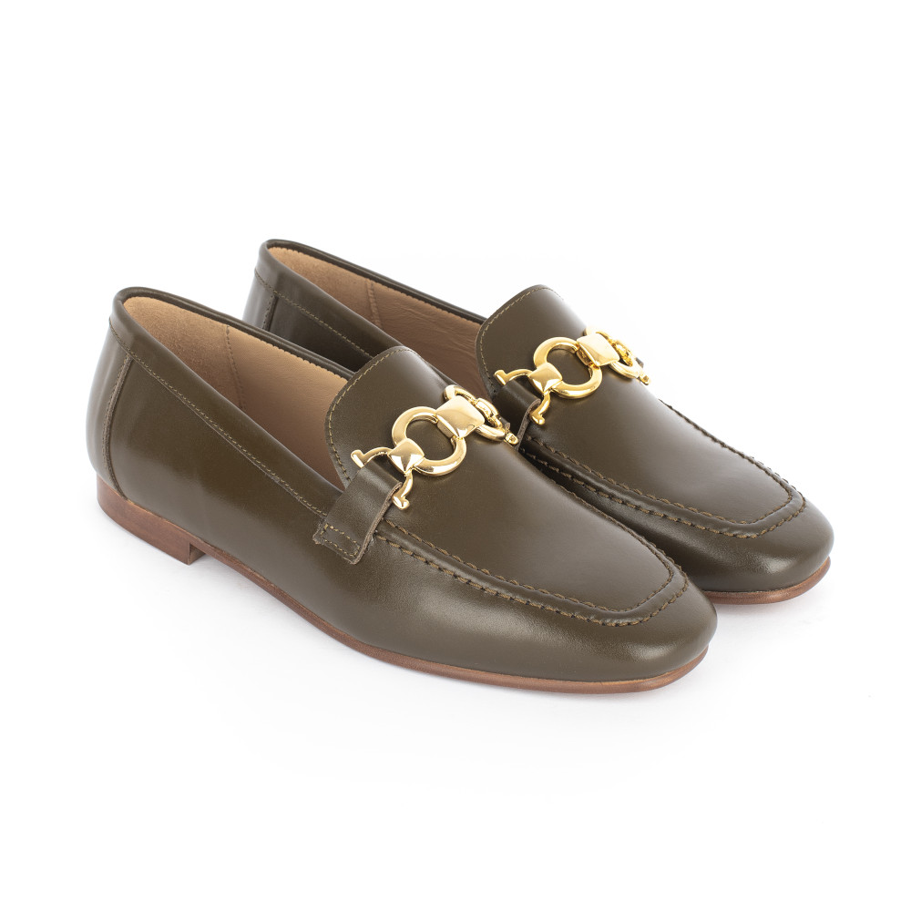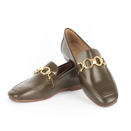 Inspirado nos modelos tradicionais de loafer, este design destaca-se pela sua silhueta estruturada e pelo detalhe metálico dourado que acrescenta um toque de requinte e personalidade.